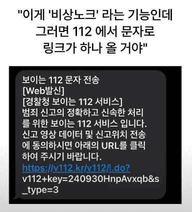 비상 노크를 하면 112 상황실에서 문자로 링크를 하나 보내줍니다. 이 링크를 클릭하는 것이 가장 중요합니다.